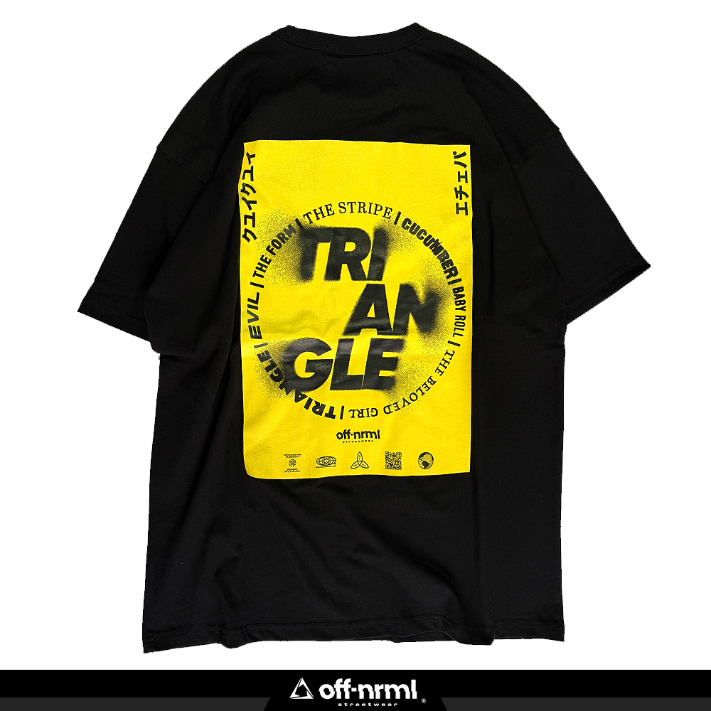 La espalda es el punto focal, con un triángulo amarillo estampado en gran formato, impreso mediante serigrafía profesional de alta definición, lo que asegura bordes nítidos, color vibrante y una alta durabilidad. Una figura simple que se transforma en un signo potente y abierto a interpretación.